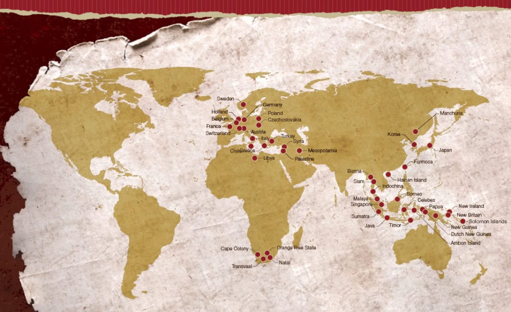 This map shows regions of the World in which Australians have been engaged in conflict and held as Prisoners of War.